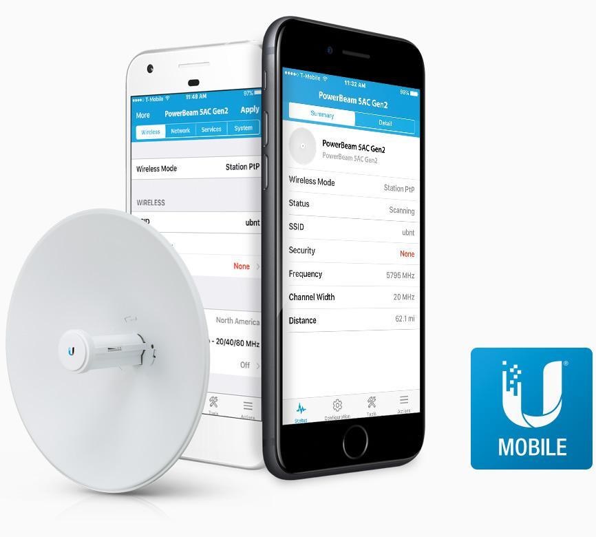 Ayrıca, zorlu kurulum bölgelerinde kurulum sırasındaki veya kurulum sonrası bakım işlemlerinizi kolaylaştırmak için cihaz üzerinde dahili olarak bulunan 20 metre uzaklığa kadar bağlantı imkanı sunan 2.4 GHz kablosuz yapılandırma yayınını kullanabilir, bu yayın sayesinde cihazınıza veya cihazınızın dahil olduğu yerel ağ üzerindeki her hangi bir noktadaki cihazınıza doğrudan ulaşabilir, ya da bu yayını Android ve IOS platformlarında üzcretsiz olarak sunulan UBNT UMobile hızlı yapılandırma yazılımı ile cihazınıza müdahale etmek için kullanabilirsiniz.